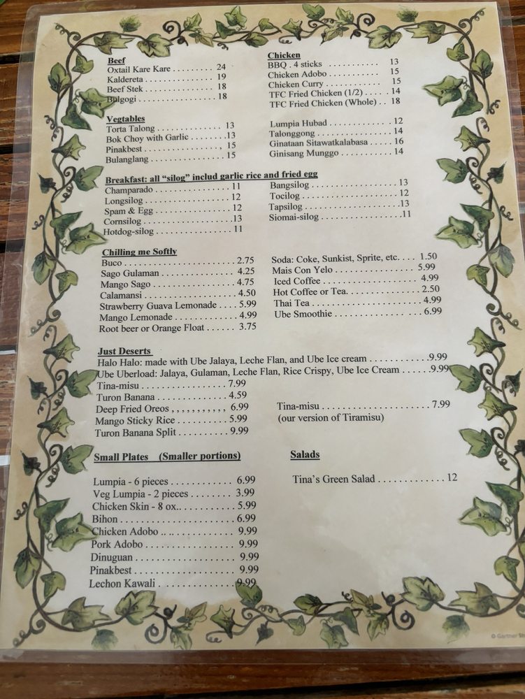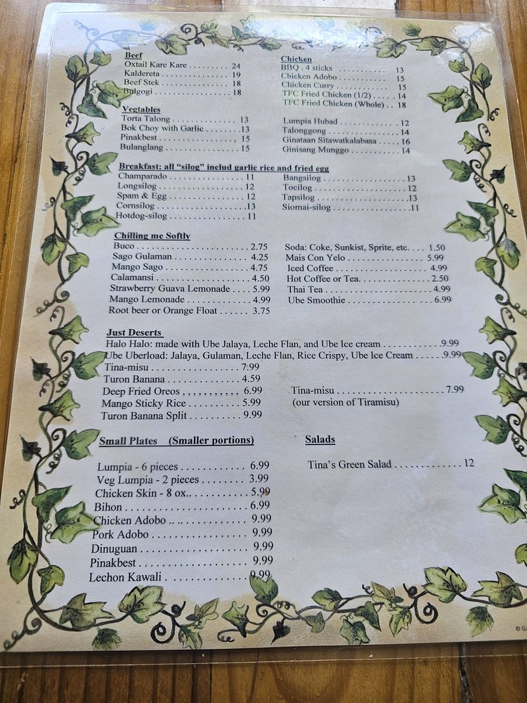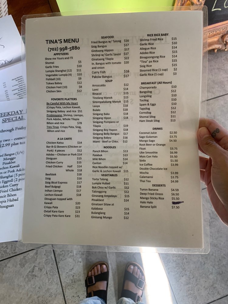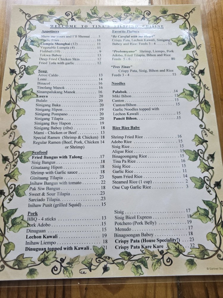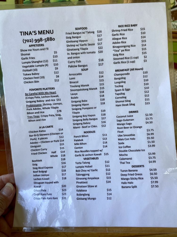 Introducing Tina’s Filipino Cuisine, a hidden gem in Las Vegas offering a range of Filipino dishes. With a variety of appetizers like Lumpia Shanghai and Tokwa Baboy, as well as favorite platters such as Be Careful with My Heart and Probinsyano, Tina’s menu is packed with flavorful options. The a la carte choices like Adobo and Sisig are highly recommended by satisfied customers. Reviewers rave about the delicious Sisig and Crispy Pata, highlighting the quality and taste of the dishes. Tina’s Filipino Cuisine provides a cozy and welcoming atmosphere, perfect for enjoying authentic Filipino cuisine. Don't miss out on the chance to experience homecooked Filipino meals right here in Las Vegas at Tina’s Filipino Cuisine.